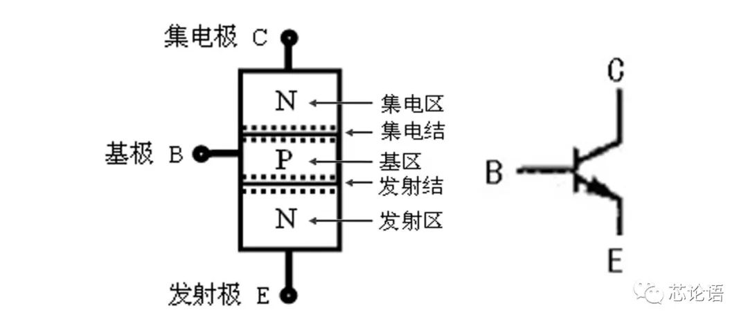 图6 .PN结型晶体管结构示意图(左)晶体管符号(右)
