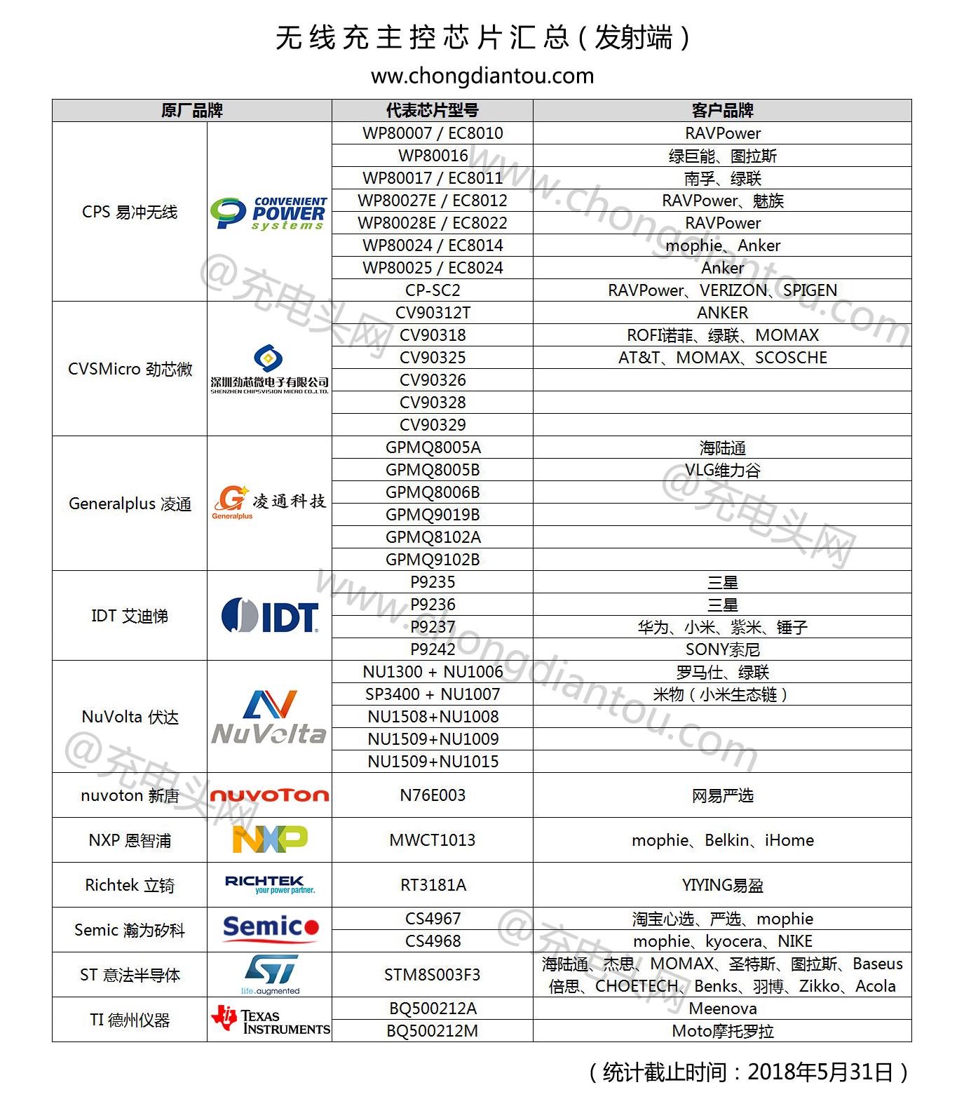 截止到2018年5月31日,充电头网通过汇总目前为止的无线充行业芯片方案,发现共涵盖有11家原厂,以及37种热门芯片型号。