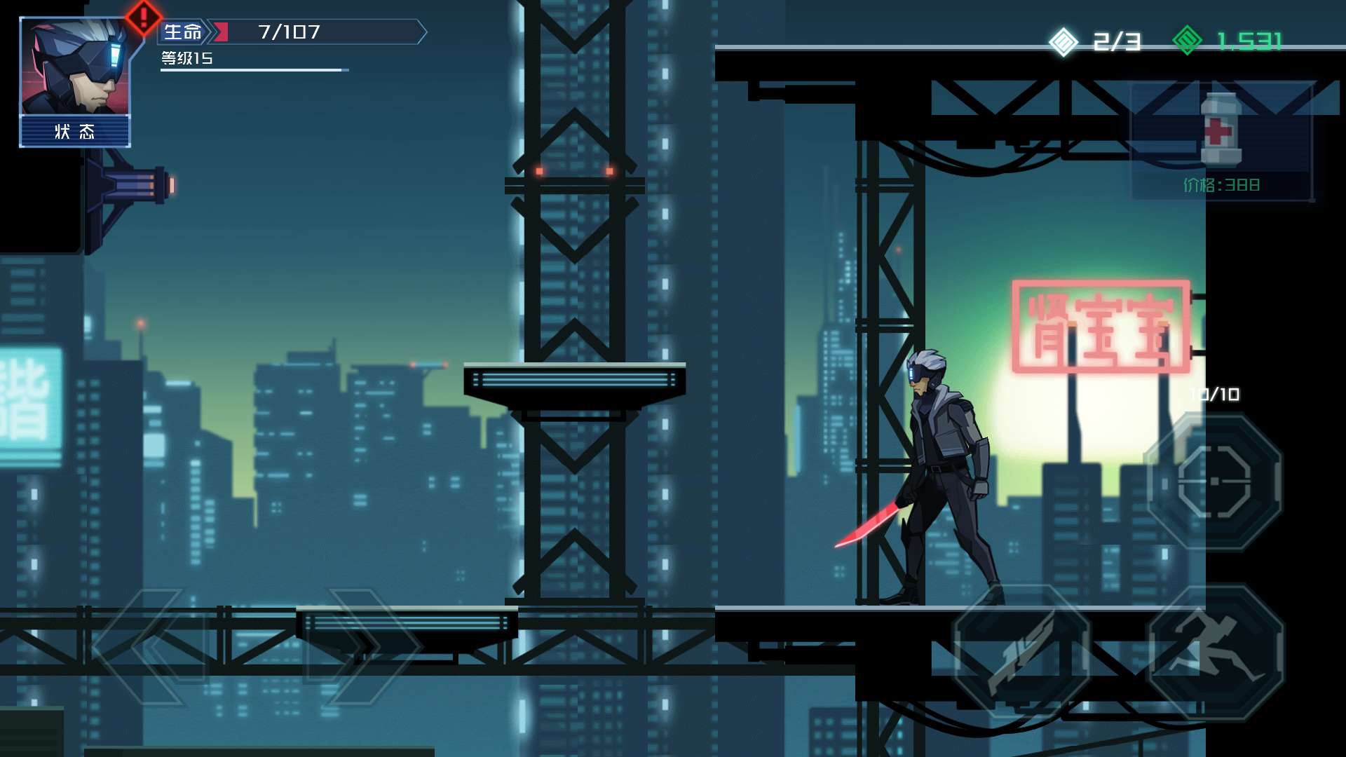 游戏的操作通过手机屏幕的左右端来进行,左下角控制主角的左右移动,右下角控制近身攻击、射击、跳跃三个动作,操作的难度一般,近身攻击三次之后,怪物会产生僵直效果,可以有效的打断一些小怪物的攻击,在游戏中也有霸体怪、远程怪、自爆怪,这样的怪就需要玩家掌控攻击频率来躲闪怪物攻击了,多种的怪物组合让笔者真是头疼不已。不过不同的怪物也有不同的应对方法,例如可以通过跳砍、射击、隔墙打(小刀居然能够穿透墙壁!果然是虚拟世界!)等方式,取巧解决。