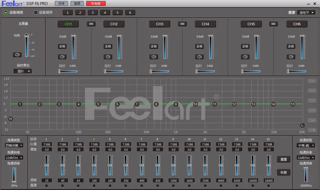 芬朗DSP F6 PRO通过专用的DSP电脑调音技术实现调音。在调音方面,芬朗DSP F6 PRO拥有15段EQ均衡、多通道延时、多通道增益及相位调节等,调试界面简洁,一目了然,反应快,精准度高,方便调音师能够快速调试出车主想要的声音效果。