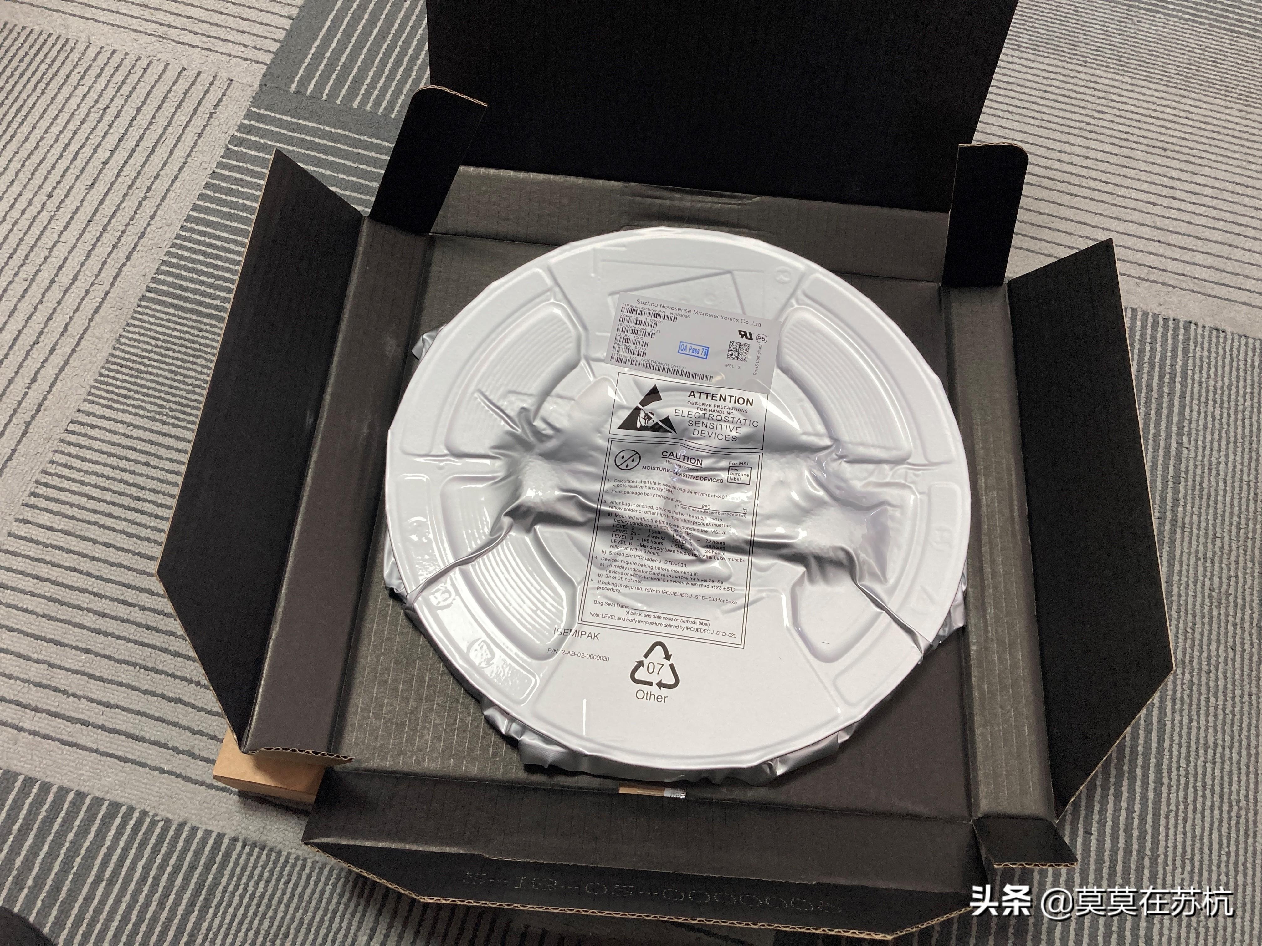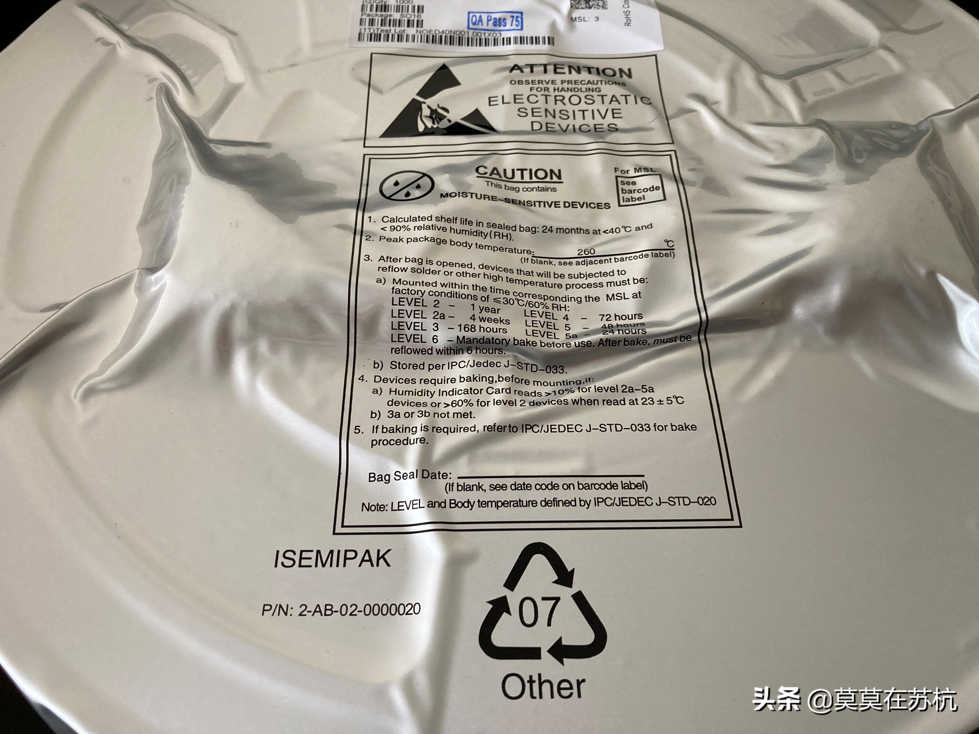 接着大家可以看到这个标识。这是静电敏感元件标识,也就是说这包芯片是静电敏感元件,要做好防静电处理,不然静电就很容易损坏元件。这种芯片是不能用手直接去触碰的,必须做好防静电处理,带好防静电手套才能触碰。
