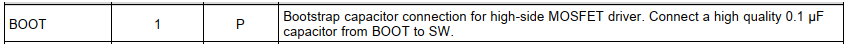 DCDC BUCK芯片有一个管脚叫BOOT,有的叫BST,如下是一个DCDC芯片对BOOT管脚的解释,在外部电路设计时,BOOT和SW管脚之间,需要加一个电容,一般是0.1uF,连接到DCDC高端MOS管的驱动端,这个电容就叫作自举电容。