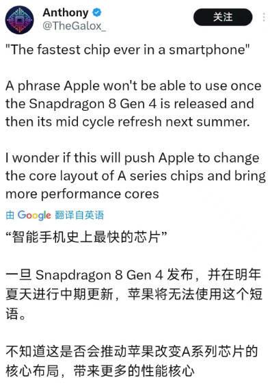 9月12日晚间,有海外博主发文称,综合目前的信息来看,一旦高通骁龙8 Gen 4移动平台发布并在明年年中推出小改款,苹果将无法再宣传A18芯片为“智能手机史上最快的芯片”。不知道这是否会推动苹果改变A系列芯片的核心布局,带来更多的性能芯片。
