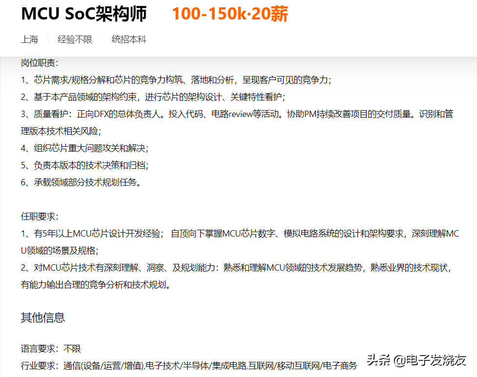 虽然央视财经受访人说行业内普遍是200万+年薪不太准确,但是确实也有人给到MCU架构师超过200万的年薪,根据招聘信息要求,如果资历达标,甚至能够拿到300万的年薪,也就是150k月薪和20薪的待遇。