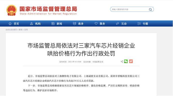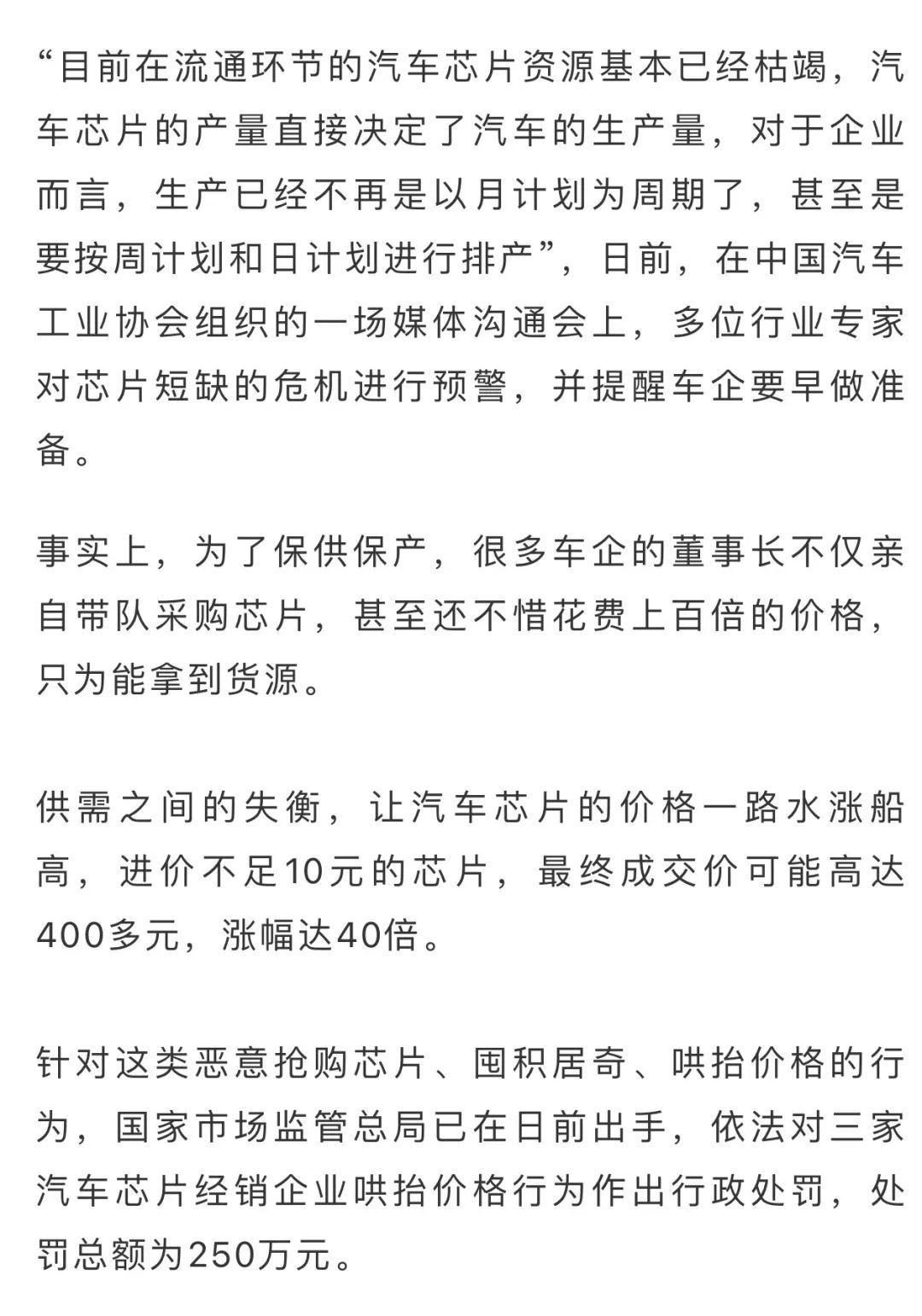 据国家市场监管总局透露,今年以来,汽车芯片生产商、授权代理商等销售芯片价格上涨幅度为10%-15%,个别芯片上涨幅度高达50%。有个别经销企业趁机恶意抢购短缺芯片,大幅加价销售,哄抬价格,造成部分汽车芯片价格持续上涨,有的上涨3-10倍,个别上涨达30-40倍。