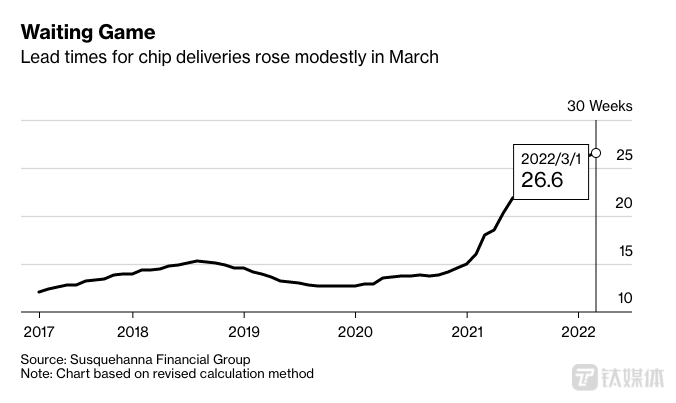 4月6日,海纳金融集团(Susquehanna)发布的最新研究报告显示,芯片从下订单到交付的时间,从2017年三个月左右时间,到今年3月,交付周期增加到半年多(26.6周)。报告指出,芯片交付时间变长将对今年整个行业产生持续性影响。