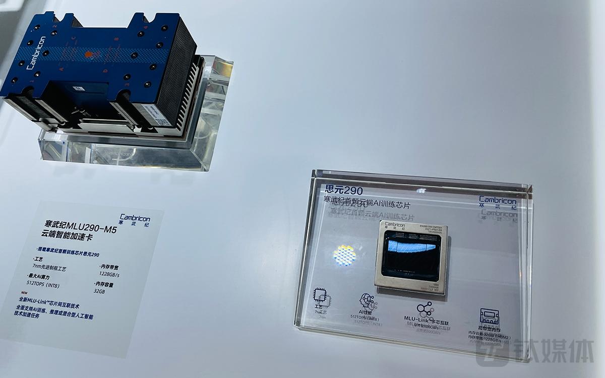“AI芯片第一股”寒武纪公司研发的国产AI芯片以及加速卡(来源:由钛媒体App编辑拍摄)