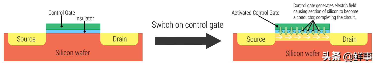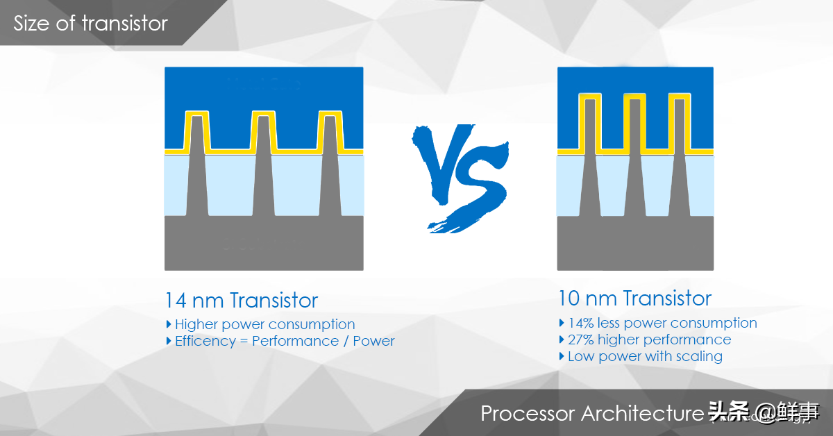 晶体管实质上由漏极(Drain),源极(Source)和栅极(Gate)组成。在源极和漏极之间有一条使电子(从而电流)流动的路径,称为通道。Gate负责控制通道的宽度。通道越宽,电子在通道中流动的速度越慢,反之亦然。处理器中提到的纳米技术是通道之间平均距离的度量。晶体管越小,源极与漏极之间的距离越小,形成栅极下方的导电沟道所需的电子或空穴的数量就越少。需要较小的输入电压以产生较少的功耗,栅极的最小宽度就是工艺制程中的X纳米。