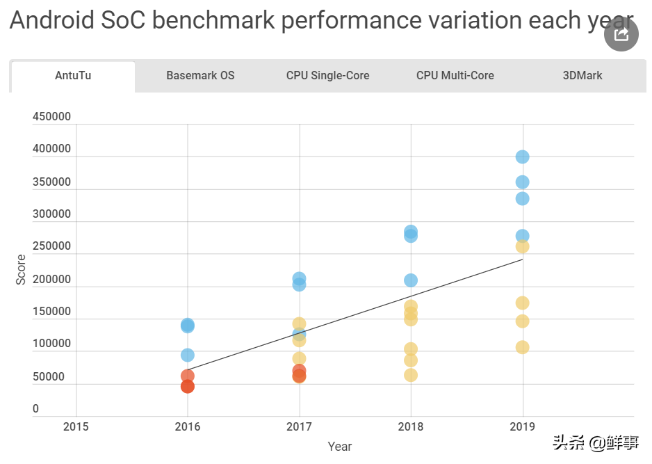 谈论智能手机之绕不开的话题:纳米? 在智能手机的世界中,不断看到终端制造厂商互相竞争,每年都在配备最新的X纳米处理器的同时发布旗舰智能手机。旗舰产品或任何智能手机必须具备的关键功能是性能、功耗和散热,在此基础上它应具有无滞后,快速且高效的界面,而这些都与"纳米"有关。智能手机的性能取决于各种因素,例如应用程序优化、RAM大小、操作系统和处理器的优化,而这其中,处理器的性能是重中之重,芯片制程工艺的数值是旗舰机比对的关键性能指标,相当于一个水杯的容量,决定着可以装多少水。下图统计了近年来Android手机在安兔兔上的跑分,但就芯片比对而言,制程的进步的确带来了性能的飞跃(蓝色:旗舰机,黄色:中端机,红色:低端机)。