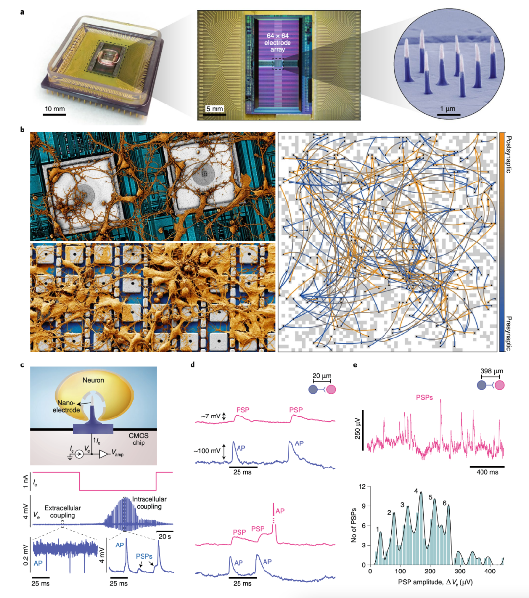 研究者使用了最新的神经科学工具,一种名为 CMOS 纳米电极阵列(CNEA)的硅神经电子接口,能够「复制」哺乳动物神经元网络的功能性突触连接图,然后把这个图「粘贴」到高密度的 3D 固态存储网络中。最新的 CNEA 将 4096 个电子通道集成在一个有 4096 个垂直纳米电极的 CMOS 芯片中 (图 a) ,将细胞内并行记录连接起来,从而可以映射 NNN 的功能性突触连接 (图 b)。在体外培养的大鼠皮层神经元网络的 19 分钟记录中,拥有 4096 个通道的 CNEA 测量了 1728 个电极的细胞内信号,可以说相比 10 个左右的片段记录实现了重大飞跃。这个数字还可以很容易地进一步增加,因为可扩展性——制造更大、更密集的 CNEA ——是 CMOS 技术的本质。