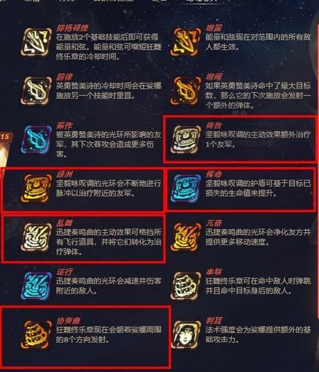 芯片选择,将W坚毅咏叹调的三个芯片点满,保证奶量足够,加上“乱舞”使E技能有风墙的效果。“协奏曲”向四面八方使用大招,提供及时的控场效果。