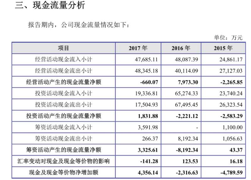 2017年,晶丰明源净利润为7611.59万元,然而经营活动现金流量为-660.07万元,主要原因是:随着业务规模的不断扩大,发行人为生产经营采购的晶圆等主要原材料有所增长”随着业务规模的扩大。2017年晶丰明源为采购生产经营的原材料晶圆以及预付封装测试服务费使得预付款项增加2135.78万元。此外,随着业务规模的扩大应收账款也有所增加。