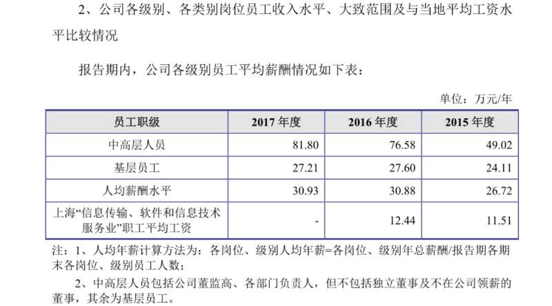 2015年到2017年,员工平均薪酬分别为26.72万元、30.88万元和30.93万元,呈现逐年稳定增长趋势,相对于上海“信息传输、软件和信息技术服务业”职工平均工资,处于较高水平。晶丰明源称,员工平均薪酬高于同地区平均水平,主要系公司作为国内领先的驱动类集成电路设计企业之一以及国内LED照明驱动芯片等细分领域的领先企业之一,为吸引更多人才,保持竞争优势,制定了较有吸引力的薪酬制度。