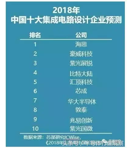 与此同时,芯谋研究还给出了一个2018中国十大集成电路设计企业的榜单。