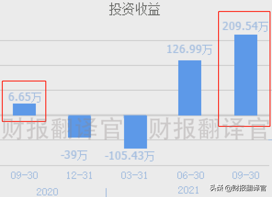 2020年第三季度,公司的投资收益只有6.65万元。到了2021年第三季度,投资收益达到了209.54万元,同比增长了3053%。