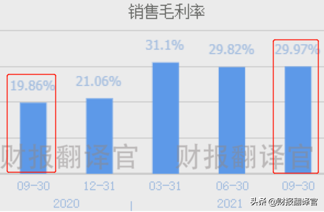 到了2021年第三季度,公司同样销售100元的化工产品,却能赚到29.97元的毛利润,销售毛利率为29.97%,同比增长了51%。
