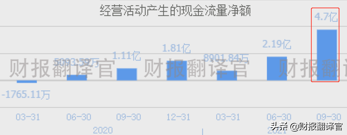 2021年第三季度,该企业的净利润为6.36亿元,而同期公司因经营活动而实际赚到的现金净额却只有4.7亿元,同比增长了322%。