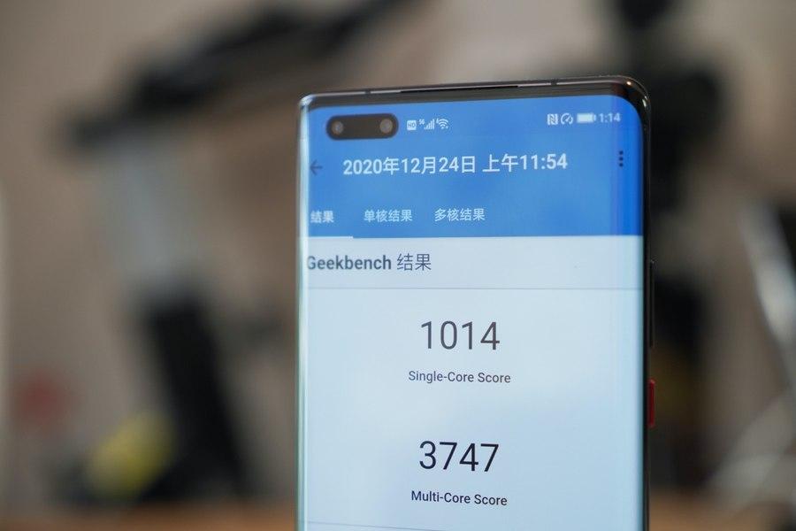 跑分部分,我们将围绕CPU、GPU、NPU分别展开。首先,CPU测试使用的软件是Geekbench。我们将华为Mate40 Pro+开启性能模式,保持电量充足并清空后台,多轮测试后Geekbench给出的单核成绩基本稳定在1014分,多核成绩为3747分。