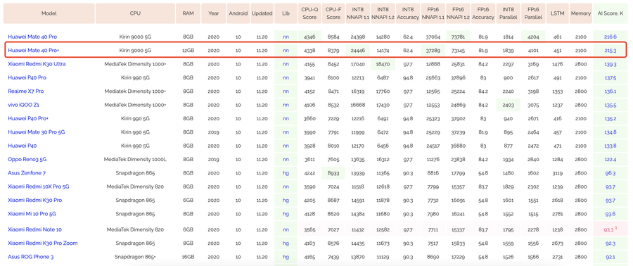 在AI-Benchmark官网可以找到更为详细的排名,Mate40 Pro+官方公布的成绩为215分,比实测还要高一些。由于这款软件没有上架iOS平台,所以没法横向对比苹果芯片了。但就与其他安卓阵营来说,麒麟芯片的NPU算力一直非常领先。