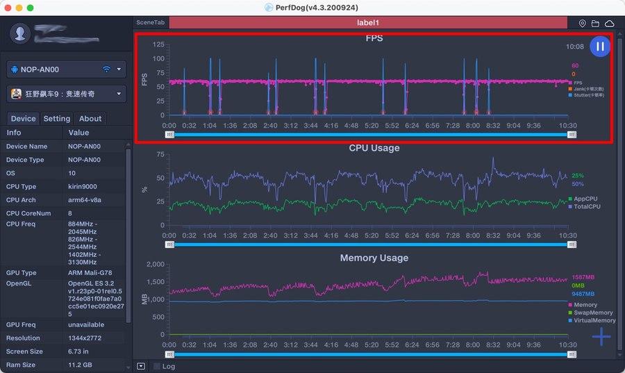 PerfDog给出的监测结果如上图所示,帧率的曲线非常平稳,基本可以满帧流畅跑满。(中间蓝色竖线是狂野飙车每局结束之后的大厅等待的数据,不计入帧率评测)