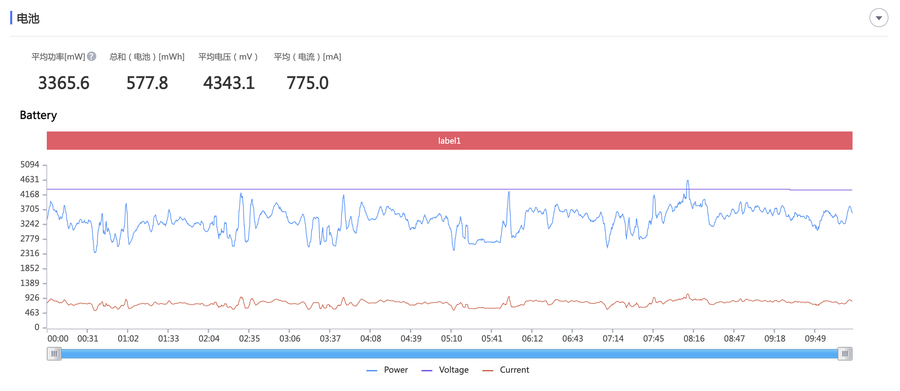 在电池能耗的分项数据中,10分钟《狂野飙车9》平均功率在3365.6mWh(截图左上角),总用电量为577.8mWh,换算下来电池耗电约156mAh。这些数据横向放在旗舰手机中明显更低,这也证明5nm工艺的芯片在功耗控制很理想。