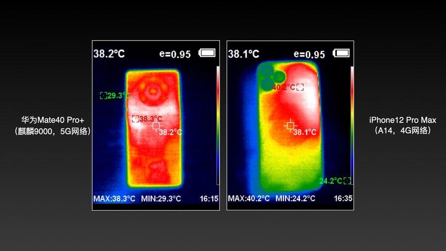大约15分钟游戏测试过后,两部机型均温度较高的背部。使用5G的华为Mate40 Pro+最高温度为38.3度,使用4G网络的iPhone12 Pro Max温度为40.2度。通过热成像照片不难发现,华为散热面积更大也更为均匀,整机温度控制更出色。我们知道,5G的功耗比4G更高,使用5G网络的Mate40 Pro+必然要比使用4G网络的iPhone12 Pro Max的发热挑战更大;而且,相比A14外挂5G基带,麒麟9000集成基带需要在更小的芯片面积内发挥性能,发热挑战进一步增大。即使在这种情况下,华为Mate40 Pro+的发热控制依然比iPhone12 Pro Max优秀,这也足以证明,华为在功耗控制上所做的努力。