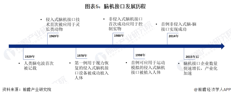 1929年,人类脑电波的存在首次被记载,为人类脑部活动研究开启了全新的可能性。1969年,侵入式脑机接口技术首次被应用于灵长类动物,这证明了大脑的神经可塑性。到1978年,第一例用于视力恢复的侵入式脑机接口设备被成功植入人体,这次尝试率先证实了脑机接口技术与仿生技术融合的可操作性,引领了用科技突破生理障碍的进一步探索。1988年,非侵入式脑机接口首次成功应用于控制实物。1998年,首例可用于运动模拟的侵入式脑机接口被植入人体。2014年,首例非侵入式脑-脑接口实现成功。2015年开始,脑机接口行业开始出现大量初创企业,这些企业成果研发了一系列消费级脑机接口产品,脑机接口技术研发成果的产业化开始加速。