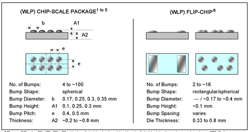图 3. 图中显示了晶片级封装和倒装芯片封装的典型尺寸以及区别。