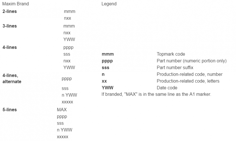 可以在快速浏览页的更多信息部分了解 UCSP 的顶标代码。某些情况下,数据资料中也有这些信息。对于反向查找,例如,从顶标确定器件的封装,可以使用网站上的顶标代码功能或下载完整的顶标表 13,利用搜索功能识别相应器件。顶标代码用于包含 12 个焊球的 UCSP。更大的 UCSP 有足够的空间打上全部型号以及日期代码等详细信息。表 2 所示为 Maxim 器件使用的商标。