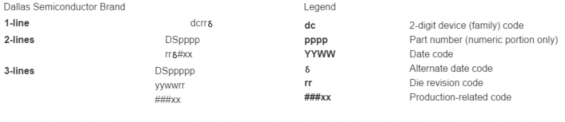表 3 中的商标类型也适用于 Dallas Semiconductor 的倒装芯片和 UCSP。激光标识非常小,需要放大镜才能看清楚。Dallas Semiconductor 的倒装芯片对最小器件采用类似方法,2 位器件代码(也称为系列码)之后是管芯的版本号,这一方法不需要交叉参考列表。