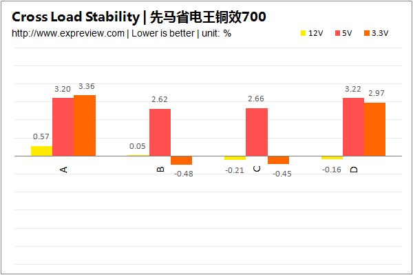 与单磁放大结构相比,双磁放大的优势是+12V、+5V、+3.3V输出互不干扰,简单来说就是每一路的输出特性都不会因为其他输出的变化而产生变化。以先马省电王铜效700W电源为例,其+5V与+3.3V采用的就是双磁放大结构,可以看出在较差负载测试中,每一路的输出电压仅与其当前负载有关,其他几路输出对其产生的影响很小。
