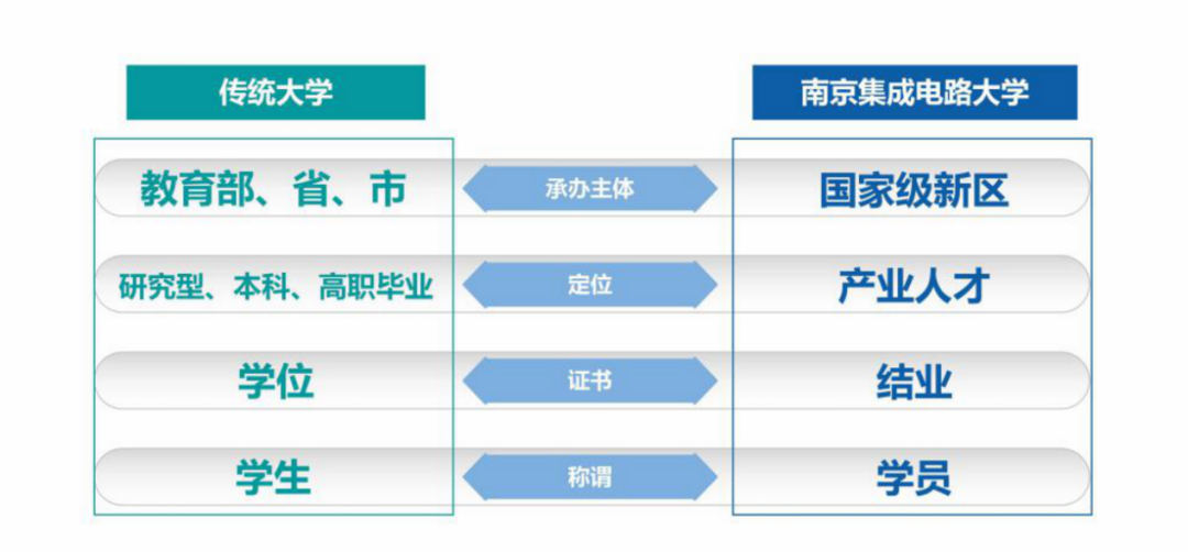 据其官网显示,该校与传统大学有四点区别。传统大学承办主体是教育部、省、市;定位为研究型、本科和高职毕业;发放学位证书;学习人员称之为学生。而南京集成电路大学承办主体是国家级新区(南京江北新区);定位于产业人才;发放结业证书;学习人员称之为学员。