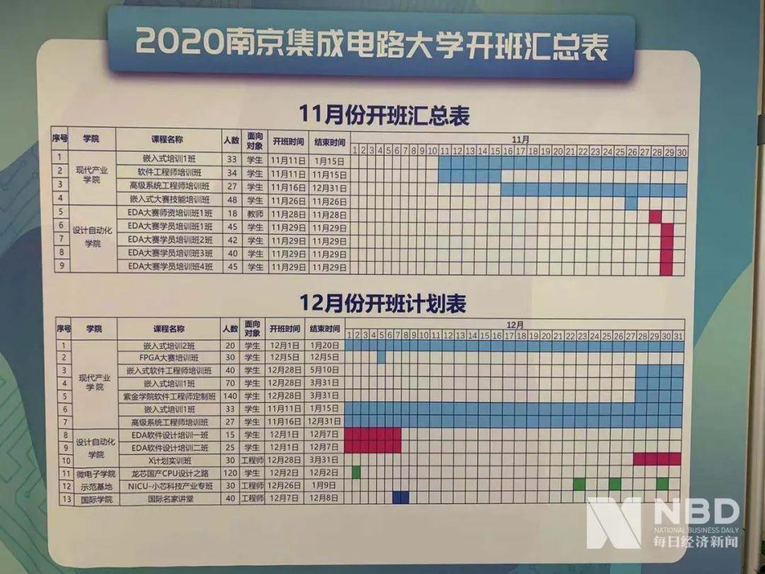 南京集成电路大学3号楼一楼展示开班汇总表显示,11月份有两个学院开班,包括现代产业学院、设计自动化学院,面向对象有学生、教师。不过从课程起止时间上看,11月份开班持续时间较短,大部分不超过一周。而12月份开班学院、课程明显增多。不过,培训的课程持续一个月的,仍以嵌入式、高级系统工程师为主。