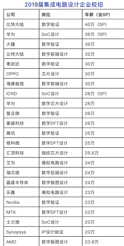 根据芯司机文章介绍,2019届芯片设计企业校招中,比特大陆、华为、大疆、寒武纪等提供的岗位收入均在20万——40万之间。而据相关行业人士对记者透露,有5年工作经验以上的模拟工程师(非模拟版图)薪资尤其高,起谈都在30万-50万。