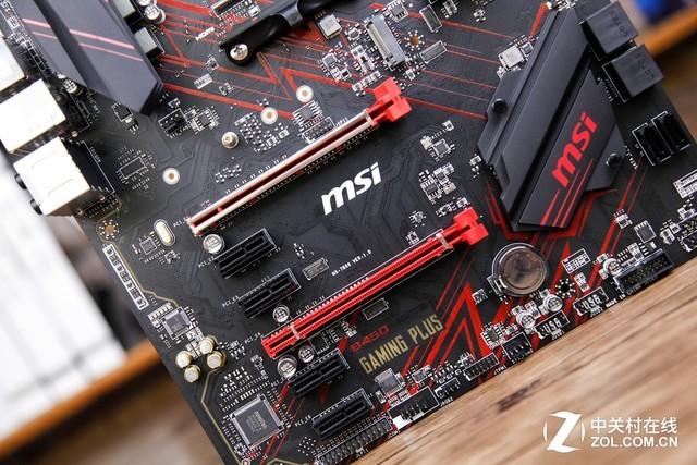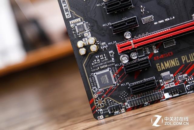 微星B450 GAMING PLUS主板的外观具有强烈的游戏气息,黑红配色与黑色PCB版上的红色纹路看起来非常和谐。