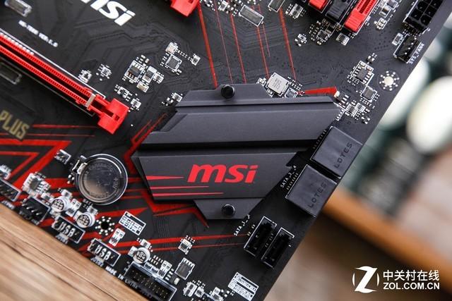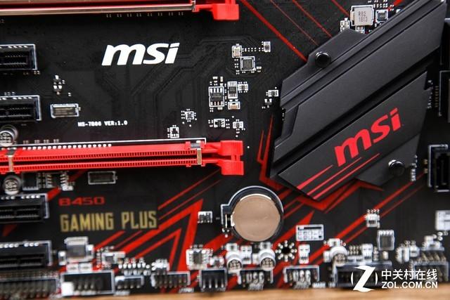 微星B450 GAMING PLUS主板的南桥散热模组体积并不大,PCB板面的红色装饰条纹也延伸到了散热模组上面,看起来更具一体感。