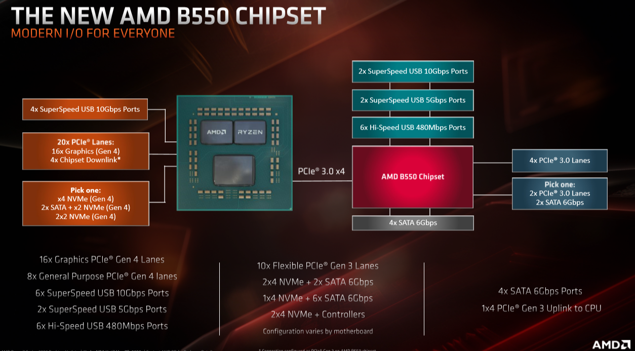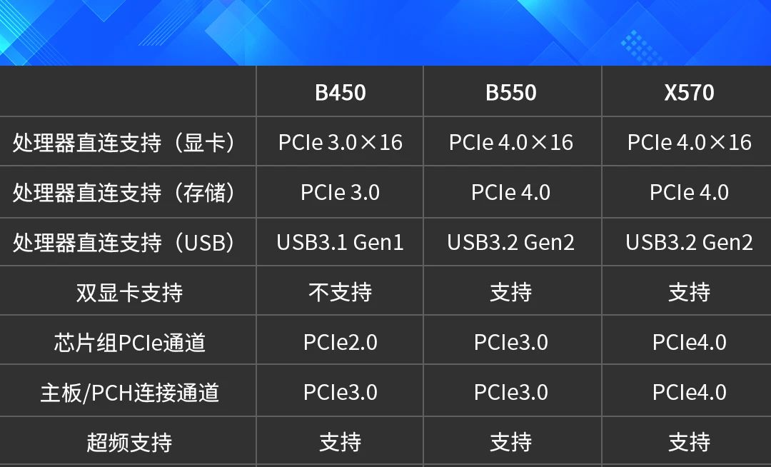 从表格可以看到,B550在各方面的表现都更接近于X570,最重要的升级就是支持处理器直出PCIe 4.0通道了,包括为显卡准备的PCIe 4.0 ×16与为M.2固态硬盘准备的PCIe 4.0×4。