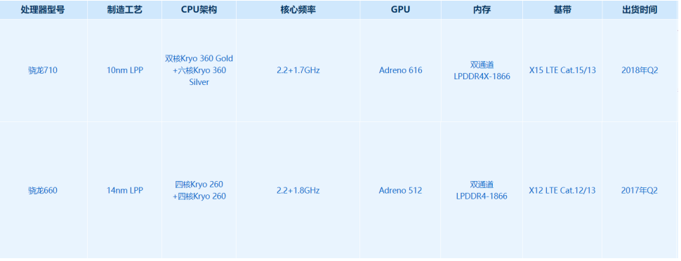 710:双核Kryo 360 Gold+六核Kryo 360 Silver | 660:四核Kryo 260+四核Kryo 260