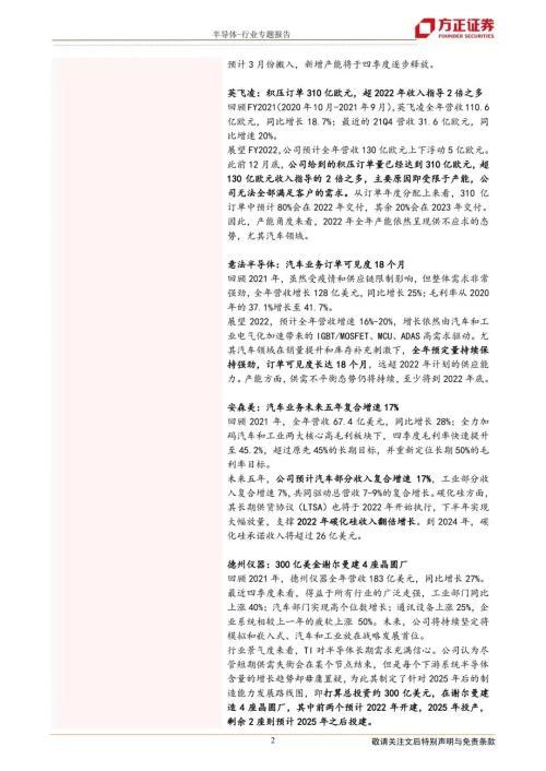 展望FY2022,公司预计全年营收130亿欧元上下浮动5亿欧元。此前12月底,公司给到的积压订单量已经达到310亿欧元,超130亿欧元收入指导的2倍之多,主要原因即受限于产能,公司无法全部满足客户的需求。 从订单年度分配上来看,310亿订单中预计80%会在2022年交付,其余20%会在2023年交付。因此,产能角度来看,2022年全年产能依然呈现供不应求的态势,尤其汽车领域。