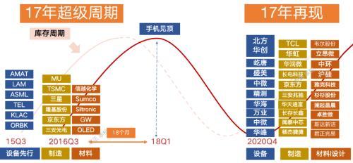 2)16年Q3~17年Q4 ,全球半导体制造巨头(台积电、三星、镁光、京东方、海力士),整个板块由于量价齐升开始涨。