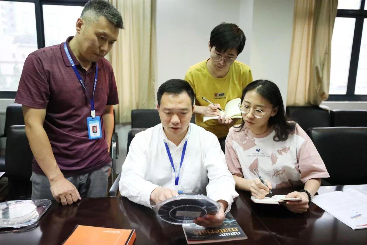 狄增峰研究员(左二)与研究团队讨论芯片栅介质材料研究进展