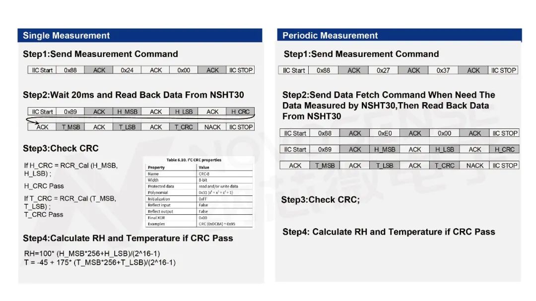 NSHT30有两种测量模式:单次触发模式和周期触发模式。当需要温湿度数据时,首先通过I2C发送地址并加写0x88(ADDR引脚接地,7Bits IIC地址0x44),然后发送单次触发指令(0x24 0x00)。芯片收到指令后进行温湿度数据测量,等待20ms完成测量;主机再通过I2C发送读方向地址(0x89),然后读取连读6个字节,最后由主机发送Nack STOP结束通信,完成一次测量。