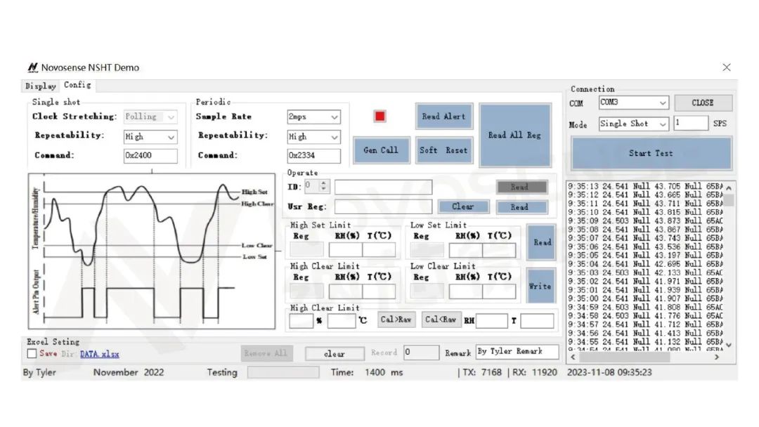 分别选择高、中、低,可以看到下面指令的同步切换。右边是周期触发模式,可以选择采样率。采样率共有5个,从0.5MPs直到10MPs,一个MPs代表1秒采一次,0.5MPs是2秒采一次,最高10MPs,1秒采10次。然后与单模一样设置重复率,三种重复率有5种采样率,组合起来是15个指令,选择后可以看到指令的同步切换。右边是读取所有温湿度寄存器的设置,点击可以获取温湿度传感器寄存器数据。