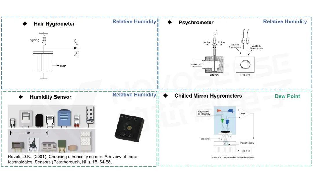 湿度可以通过一系列方法进行测量,比如传统的毛发湿度计,通过毛发吸收水蒸气形成一定的收缩来测量相对湿度。在工业温箱中,常会用到干湿球法湿度计,通过蒸发使温度降低,以温度差来度量相对湿度。另外,比较常见的高精度测量方法是露点仪,通过控制镜面温度,以光学测量方法寻找当前空气结霜结露的临界温度点来测量湿度。