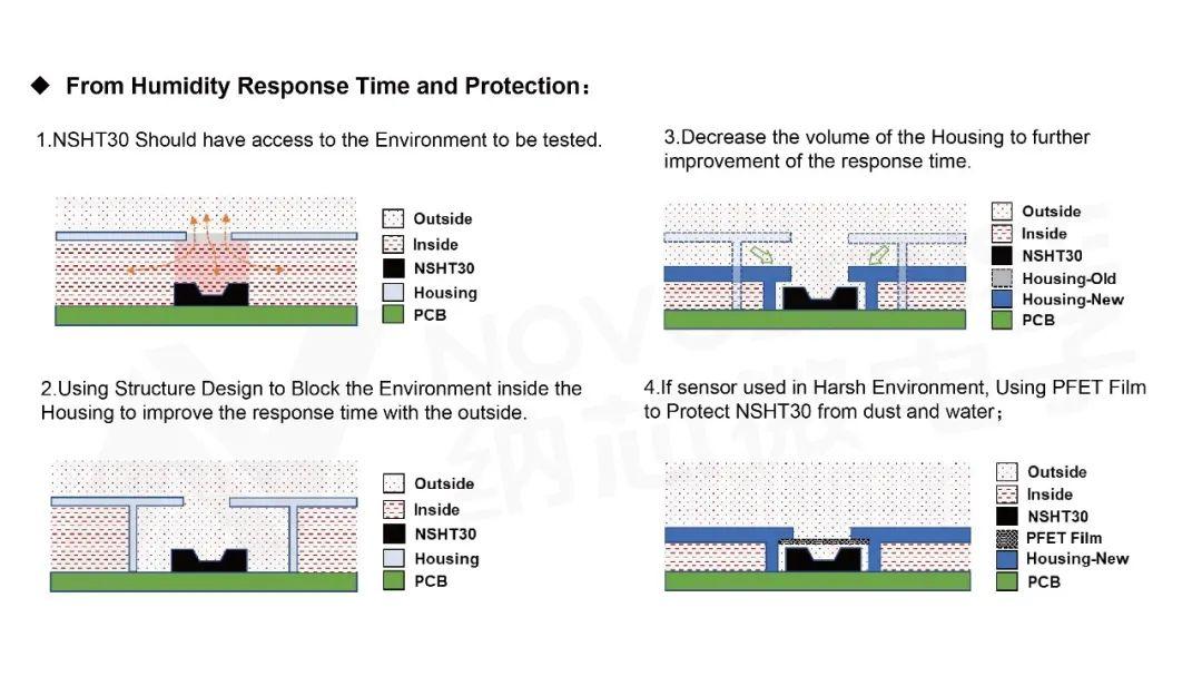 温湿度传感器区域和壳体内部需要进行物理隔离,以提高响应速度,降低壳体内部空气对相对湿度测试值的影响。
