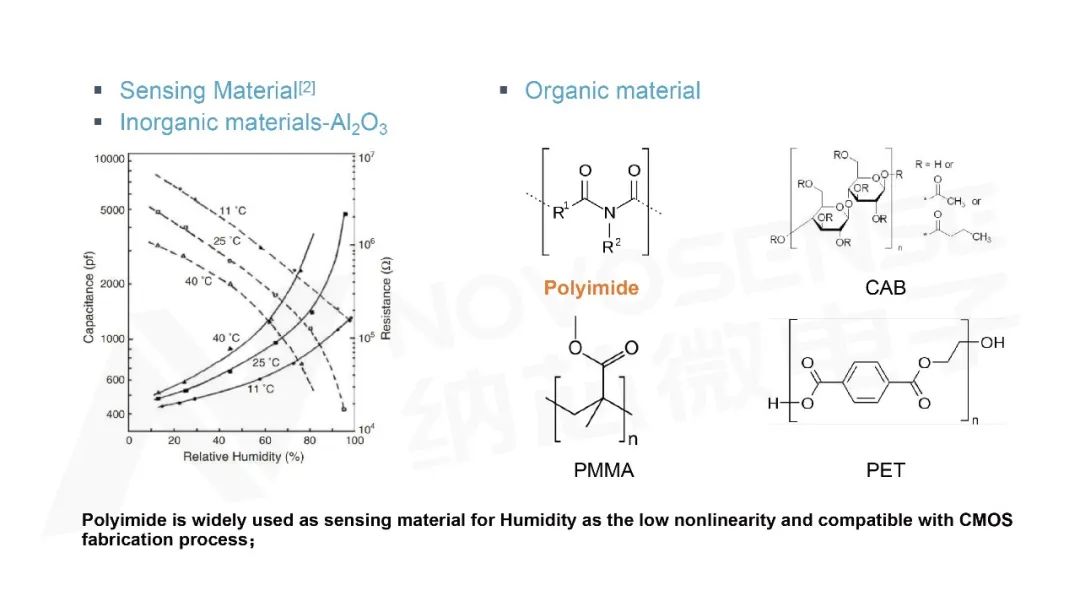 电容式湿度测量的敏感材料,可以大致分为无机敏感材料(例如三氧化二铝)和有机敏感材料(例如醋酸丁酯,聚酰亚胺等)。有机材料相比三氧化二铝,在线性度,温度系数上存在显著优势,逐渐取代无机材料,应用于容式湿度传感器中;其中聚酰亚胺材料因其与CMOS工艺兼容性上的优势,在温湿度集成传感器上已成为主流。