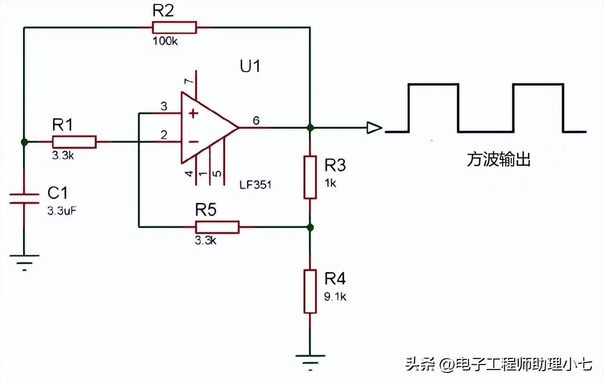 用于通过外部添加少量电阻和电容来产生方波 。就像施密特触发器电路一样,比较器动作的参考电压取决于输出电压。输出频率的值,用以下公式: