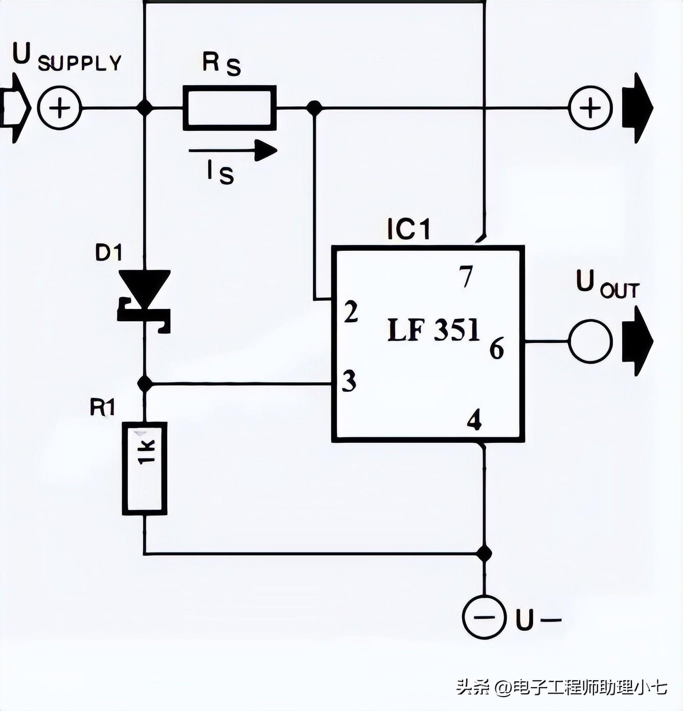 下面的电路图说明了如何在当前通道中使用检测电阻器和 LF351 IC 构建该电路。使用二极管可以在运算放大器的反相端子和非反相端子之间产生电压差。一般情况下,电路中二极管两端的压降为0.2-0.3V。