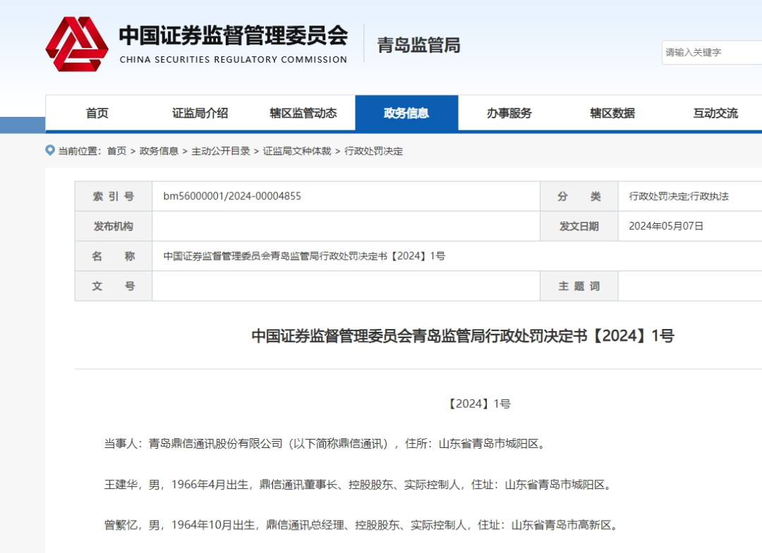 5月8日晚间,鼎信通讯公告披露,5月8日,公司收到青岛证监局《行政处罚决定书》(〔2024〕1号),包括上市公司、鼎信通讯董事长王建华、总经理曾繁忆等在内的相关方被给予警告,并被处以总计275万元罚款。