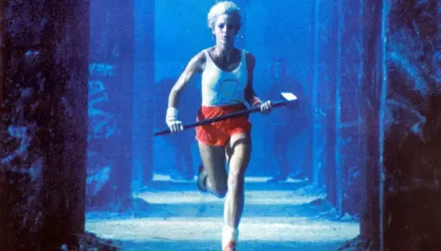 突然,冲进来一个白衫红裤的姑娘,手里握着一个大铁锤,